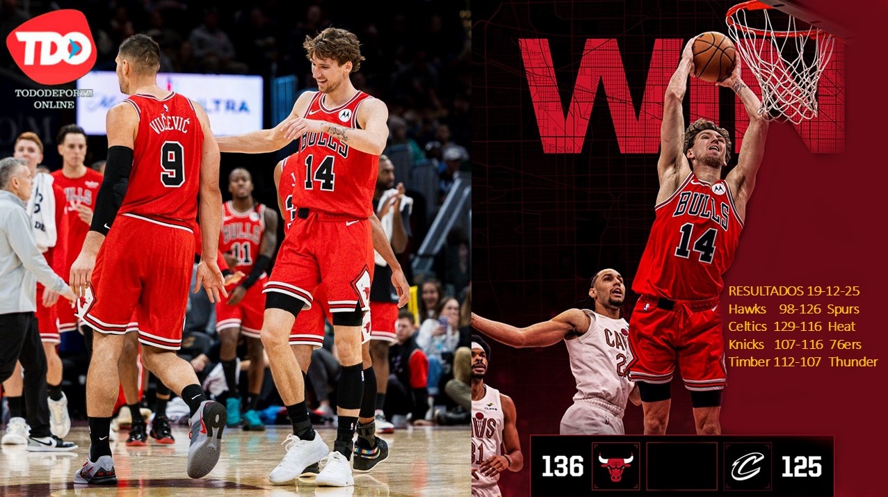 Cleveland, OH.- Matas Buzelis y Nikola Vucevic anotaron cada uno 24 puntos, para que los Bulls de Chicago embistieran de visita a los tambalentes Cavaliers por 136-125.