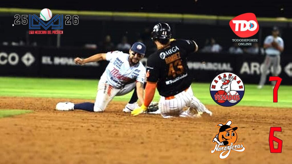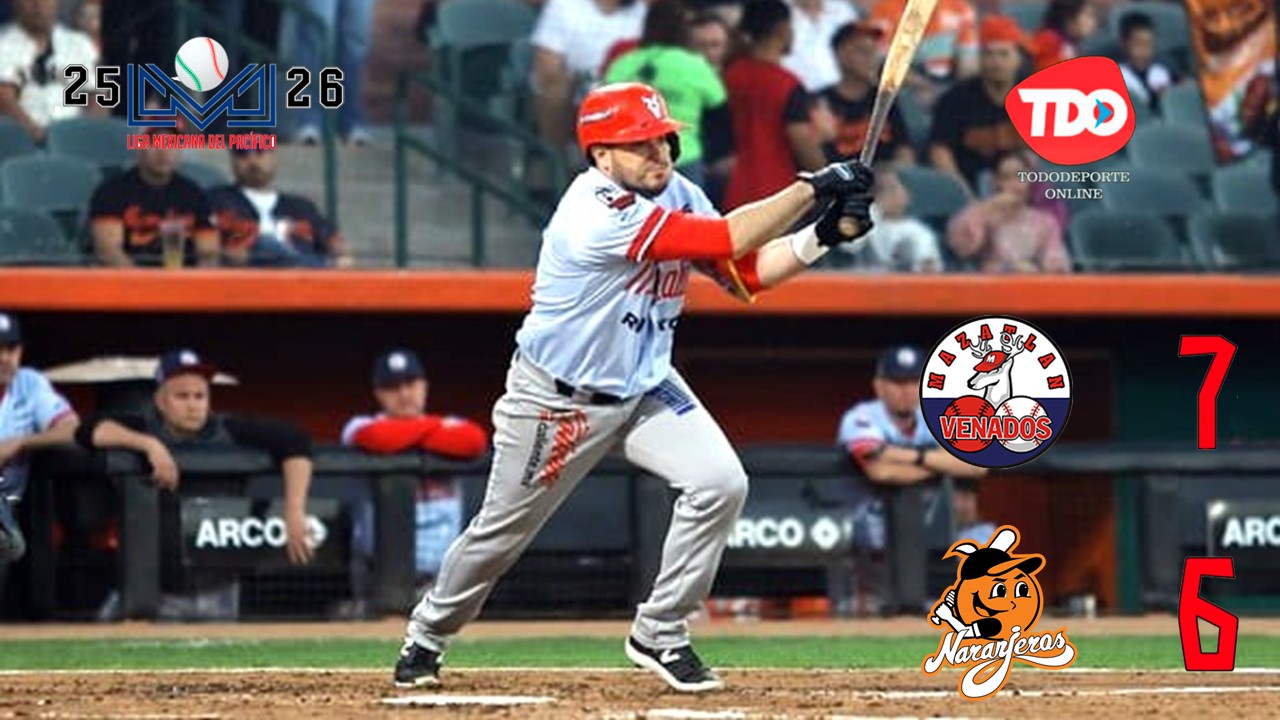 Hermosillo, Sonora.- Los Venados de Mazatlán se salvaron de la limpia en el estadio Fernando Valenzuela tras derrotar de forma apurada a los Naranjeros con pizarra de 7-6 al concluir la octava serie de la campaña 2025-2026 de la Liga Mexicana del Pacífico.