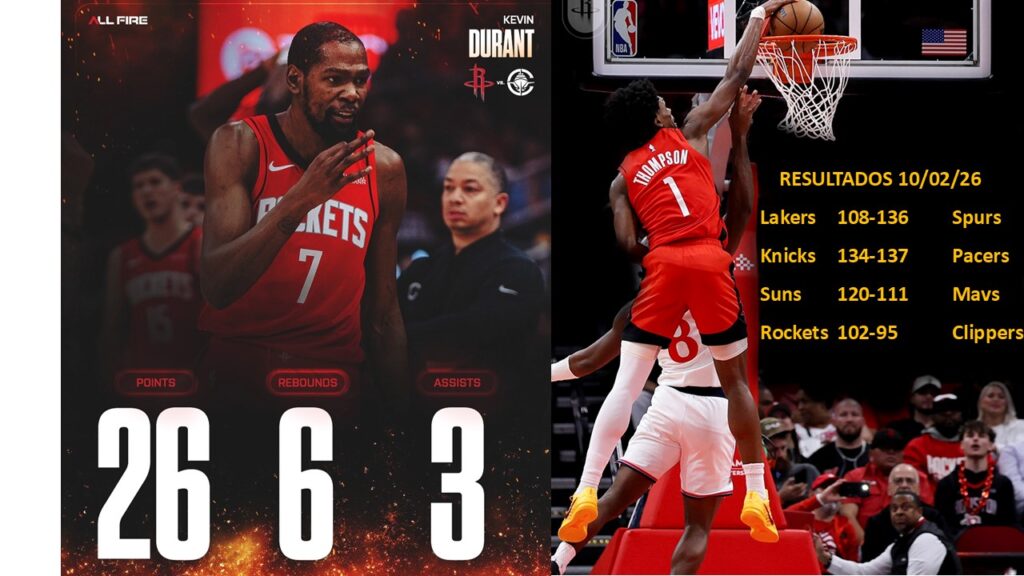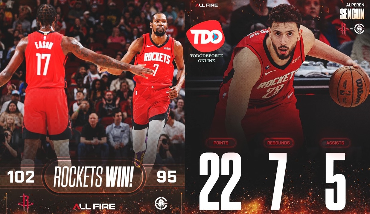 Durant anotó 26 puntos y encestó tres triples, mientras que Sengun sumó 22 puntos, siete rebotes y cinco asistencias. Amen Thompson añadió 16 puntos y seis rebotes para los Rockets, y su mate en transición a 11:20 del final les dio a los Rockets su primera ventaja de dos dígitos con 83-72.