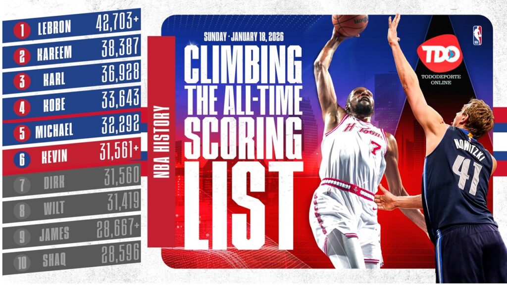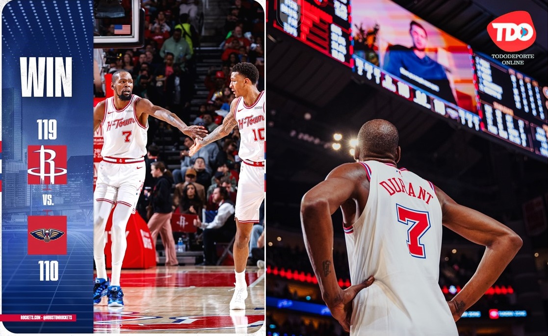Houston, TX.- Kevin Durant sumó 18 puntos en la victoria de los Rockets sobre los Pelicanos de Nueva Orleans, para llegar a 31,562 de por vida y trepar al sexto peldaño de la lista de jugadores con más unidades en la NBA.