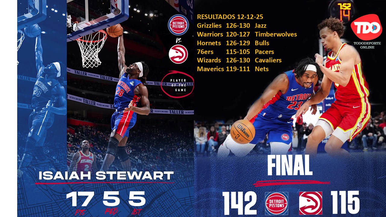 Detroit, MI.- DETROIT (AP) – Isaiah Stewart anotó 17 puntos para liderar un ataque equilibrado y conducir la victoria de los Pistons sobre los Halcones de Atlanta con apabullante 142-115 el viernes por la noche.