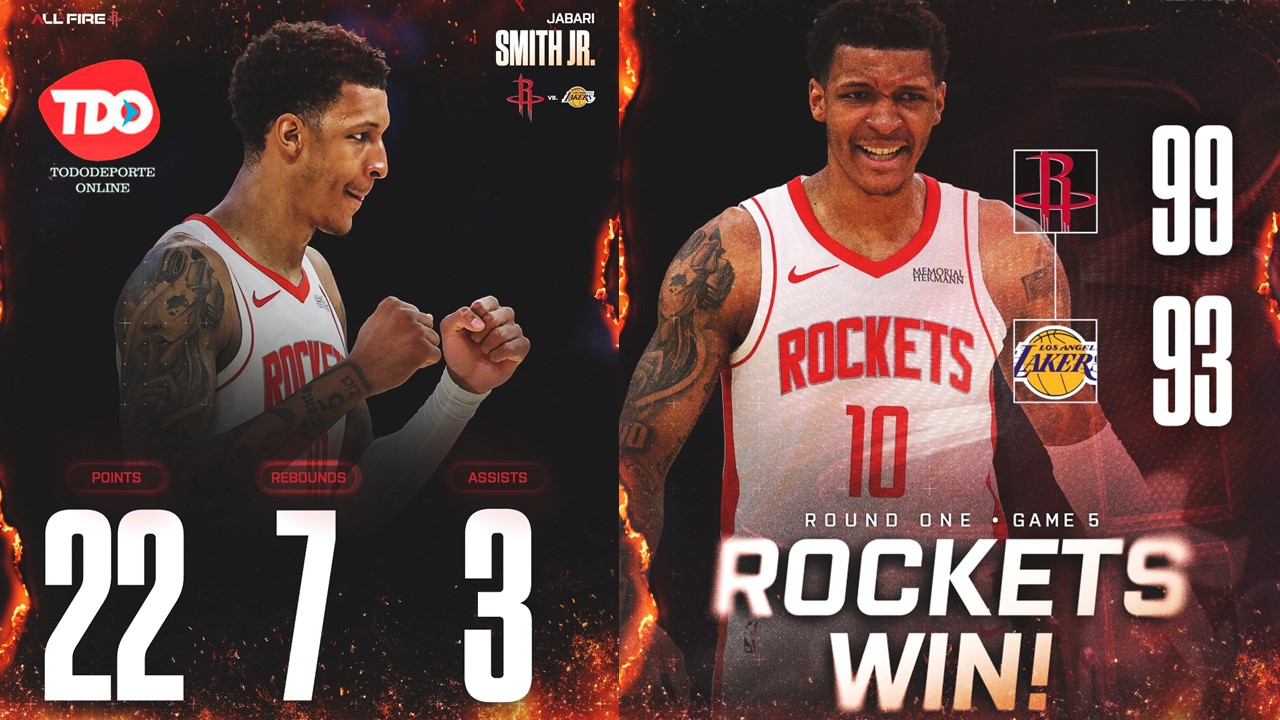 Los Ángeles, CA.- Jabari Smith Jr. anotó 22 puntos, Tari Eason sumó 18 y los Rockets de Houston evitaron la eliminación de los playoffs por segundo partido consecutivo con una victoria 99-93 sobre los Lakers en el quinto juego la noche del miércoles, recortando la ventaja en la serie de la primera ronda a 3-2.