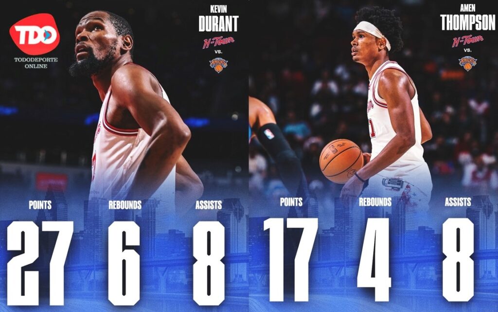 Kevin Durant lideró el triunfo coral de los Rockets con 27 puntos, Reed Sheppard sumó otros 20 puntos, Amen Thompson y Tari Eason terminaron con 17 cada uno, mientras que Alperen Sengun firmó un doble-doble con 13 puntos y 10 asistencias.