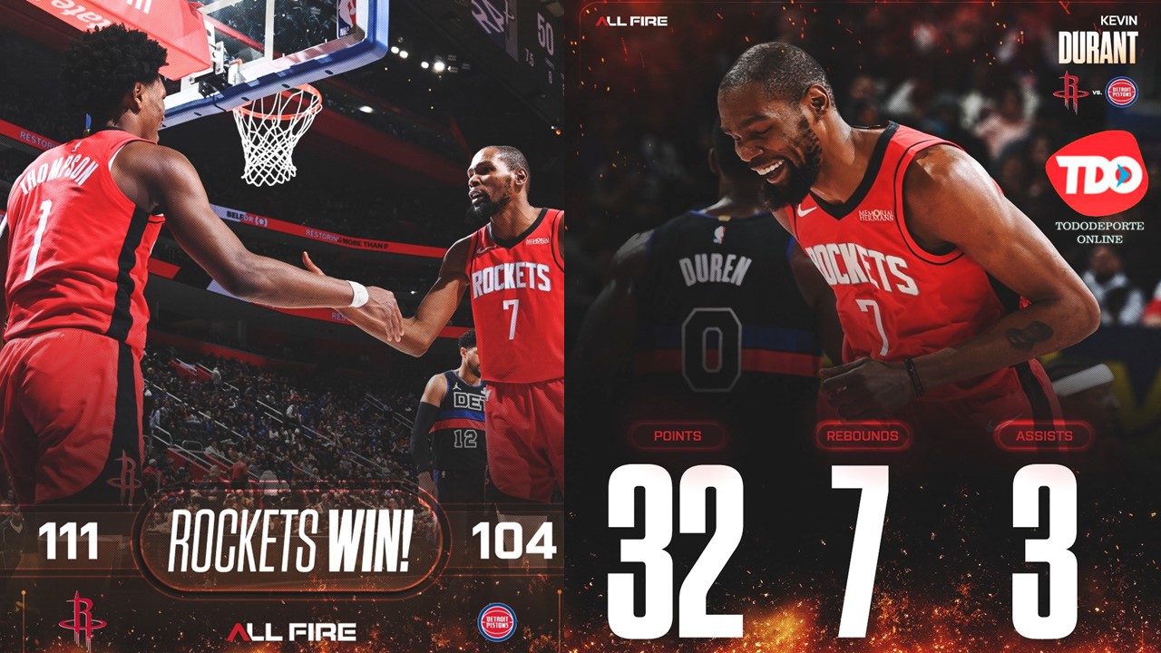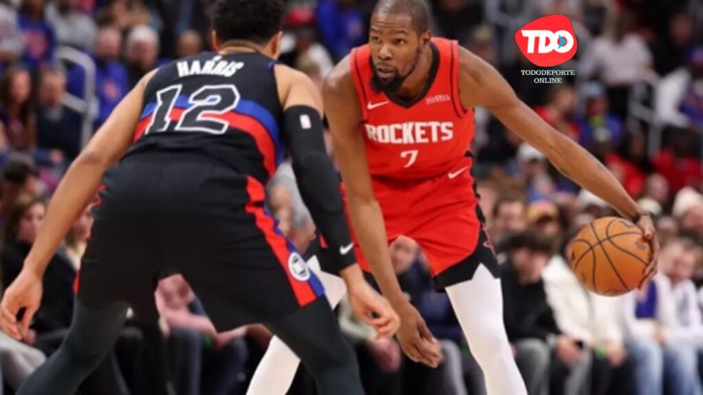 Detroit, MI.- Los Rocketes de Houston Rockets pusieron fin a una racha de cinco derrotas consecutivas fuera de casa al imponerse 111-104 sobre los Pistos, apoyados en los 32 puntos del estelar Kevin Durant en el Little Caesars Arena (Detroit).