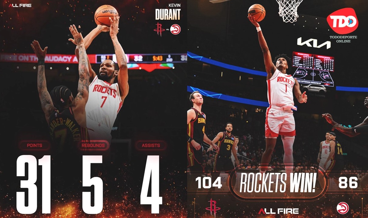 Durant, quien llegó al partido con un promedio de 29.3 puntos en 32 partidos contra Atlanta, encestó 12 de 22 tiros de campo, incluyendo tres triples. El atlantense Jabari Smith añadió 14 puntos y ocho rebotes, y Reed Sheppard anotó 13. Josh Okogie anotó 10 puntos y 10 rebotes.