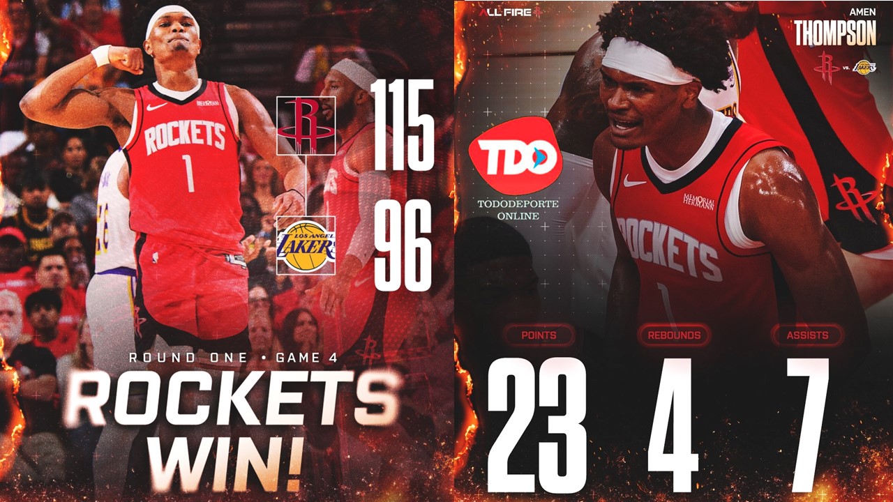 Houston, TX.- Amen Thompson anotó 23 puntos, Tari Eason sumó 20 y los Rockets evitaron la eliminación con una paliza de 115-96 sobre los Los Lakers de Los Ángeles Lakers en el cuarto juego de la serie de playoffs de la Conferencia Oeste el domingo por la noche.