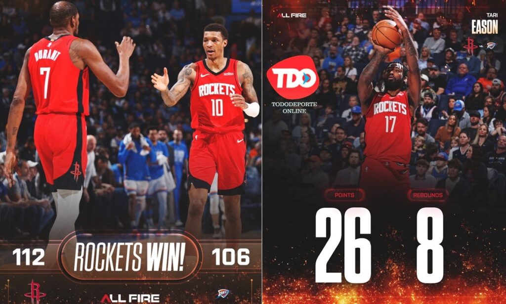 Oklahoma City, OK.- Comandado por una tremenda salida de Tari Eason, quien anotó 26 puntos, la mayor cantidad de la temporada, los Rockets de Houston se impusieron de visita sobre Thunder por 112-106.