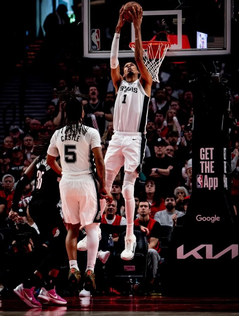 Wenbanyama , quien figuraba como «cuestionable» en el reporte de lesiones previo al encuentro, fue titular y provocó exclamaciones de asombro entre el público del Moda Center con una enfática volcada a falta de 9:58 minutos para el final de la primera mitad.