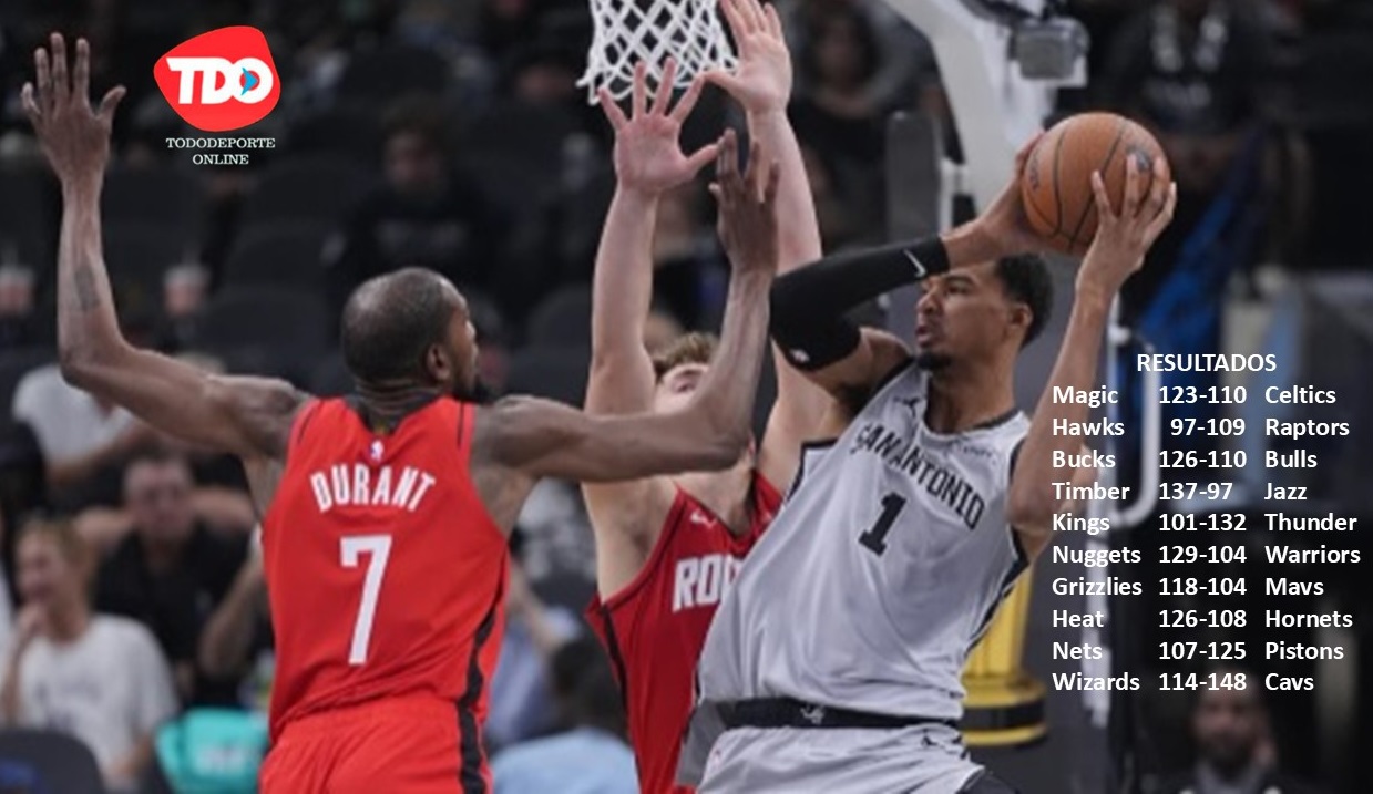 San Antonio, TX.- Harrison Barnes anotó 24 puntos, Julian Champagnie y Victor Wembanyama añadieron 22 cada uno y los Spurs de San Antonio vencieron 121-110 a los Rockets de Houston el viernes por la noche en el inicio de la Copa NBA para ambos equipos.