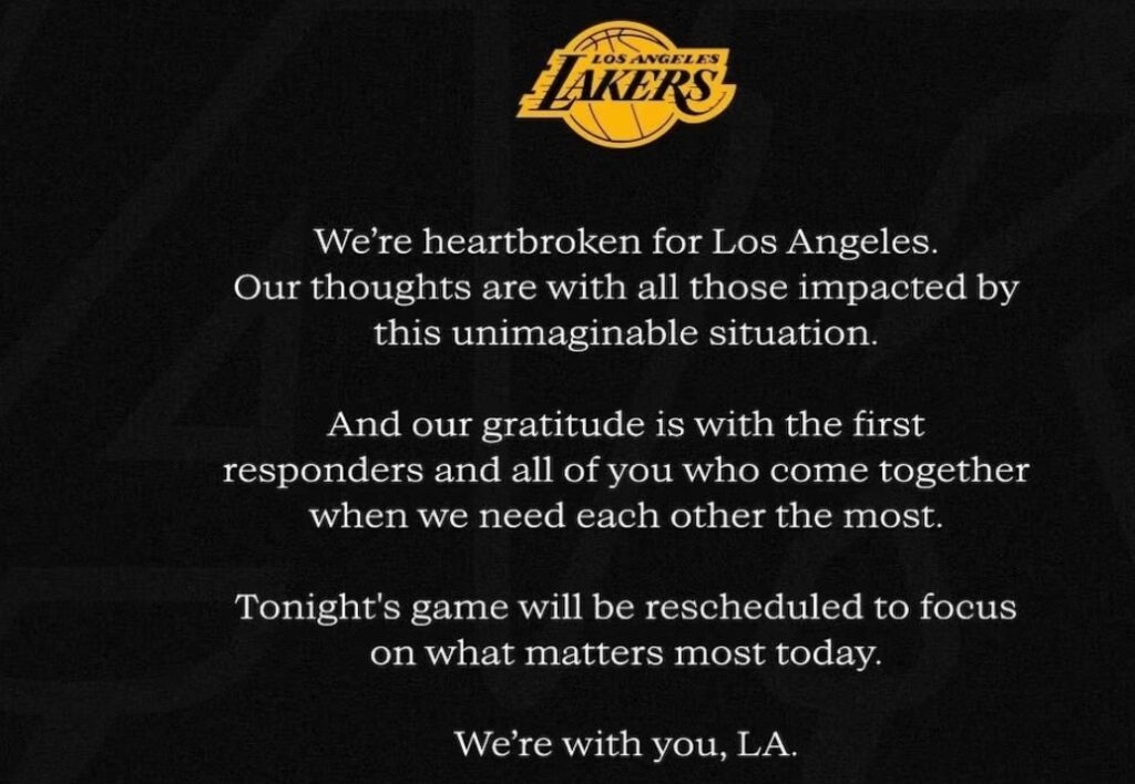 “Estamos con el corazón roto por Los Ángeles. Nuestros pensamientos están con todos aquellos afectados por esta situación inimaginable. Nuestra gratitud está con los socorristas y con todos ustedes que se unen cuando más nos necesitamos. El partido de esta noche será reprogramado para enfocarnos en lo que más importa hoy. Estamos contigo, LA”, firmaron los Lakers en un comunicado publicado en su cuenta en X (antes Twitter).
