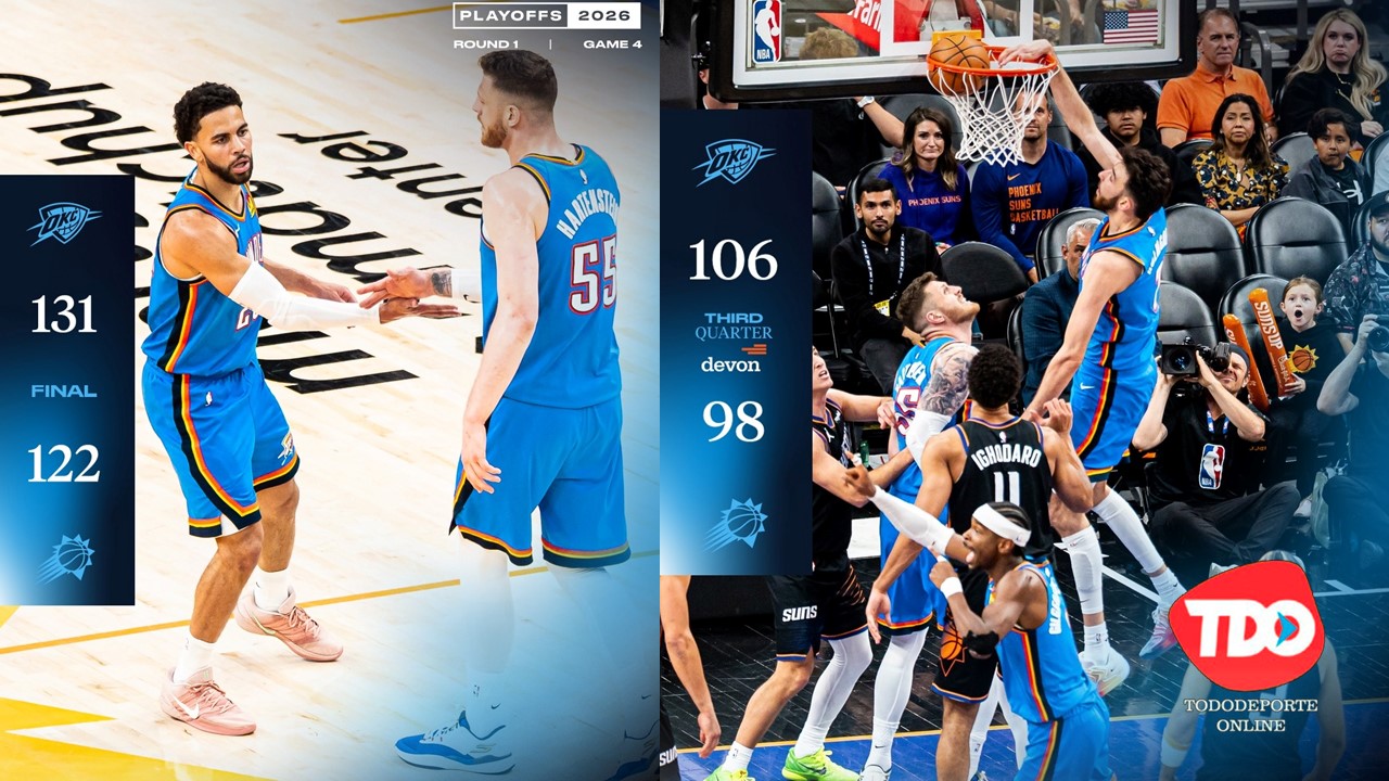 Phoenix, AZ.- PHOENIX (AP) – Shai Gilgeous-Alexander anotó 31 puntos, Chet Holmgren sumó 24 y el Thunder de Oklahoma derrotó 131-122 a los Suns la noche del lunes, para completar una barrida de cuatro partidos en la serie de primera ronda.