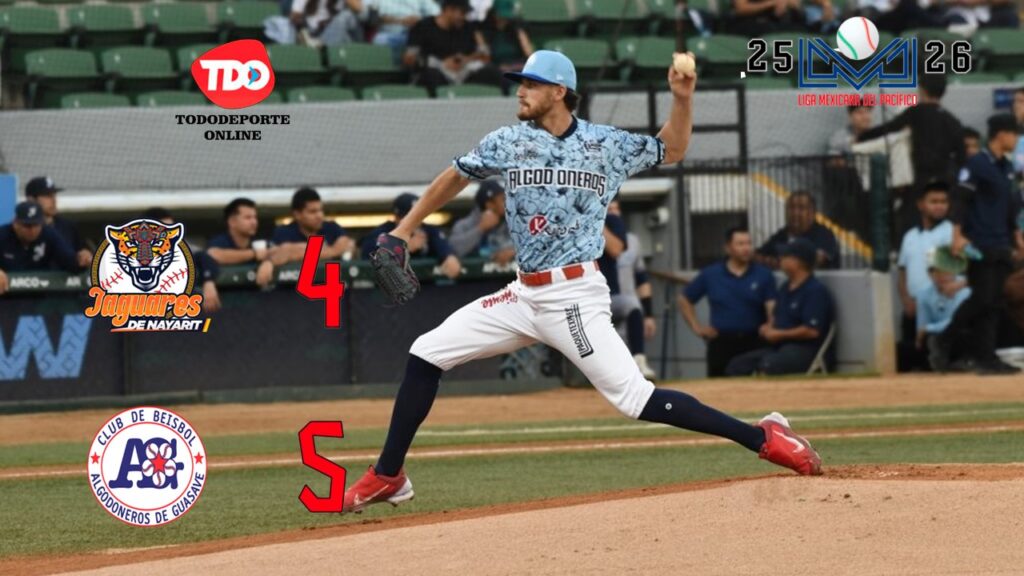 Guasave, Sinaloa.- Los Algodoneros se colocaron a un triunfo de avanzar a las semifinales de la temporada 2025-2026 de la Liga Mexicana del Pacífico tras derrotar 5-4 en 12 entradas a los Jaguares de Nayarit en el tercer juego de la ronda de playoffs.