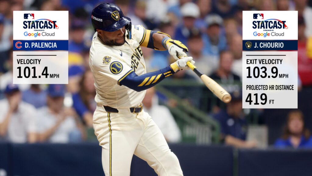 Pero fue una noche diferente la del lunes, cuando Vaughn y Contreras conectaron ante el abridor zurdo de los Cachorros, Shota Imanaga, y Chourio la botó frente al derecho Daniel Palencia. La recta de 101.4 mph con la que Chourio hizo contacto fue el lanzamiento más rápido convertido en jonrón en la historia de la postemporada desde que se registran los pitcheos (2008). El récord anterior pertenecía a Nelson Cruz, de los Rangers, quien en el Juego 5 de la Serie de Campeonato de la Liga Americana de 2011 conectó un cuadrangular ante una recta de 100.6 mph del as de los Tigres, Justin Verlander.