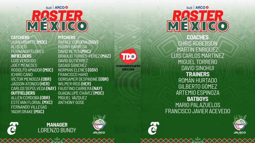 Guadalajara, Jalisco.- La Liga Mexicana del Pacífico y los clubes Charros de Jalisco y Tomateros de Culiacán revelaron este martes los rosters de 28 jugadores de los selectivos aztecas que buscarán a dar nuestro país la décima corona en la Serie del Caribe 2026, a celebrarse en el estadio Panamericano de Zapopan.