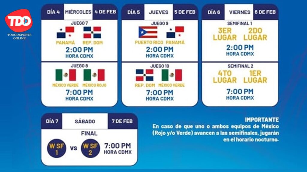 En caso de que clasifique al menos un representativo de México a las semifinales, su compromiso se disputará en el horario nocturno. Si ambos equipos mexicanos avanzan a esta fase y deben enfrentarse entre sí, dicho encuentro se programará igualmente en el turno nocturno. En caso contrario, el representativo con mejor posición en la tabla de clasificación será asignado a ese horario. Cabe destacar que los horarios del certamen están establecidos conforme a la hora local de Guadalajara, la cual presenta una diferencia de dos horas respecto a República Dominicana y Puerto Rico, y de una hora con Panamá.