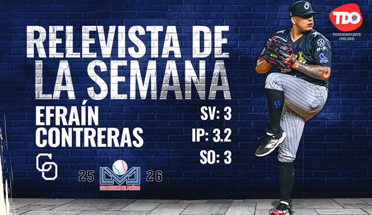 Guadalajara, Jalisco.- Con 3 rescates en igual número de oportunidades, Efraín Contreras, de los Yaquis de Ciudad Obregón, ganó el reconocimiento a Relevista de la Semana, que desarrolló las series 4 y 5 del rol regular de la campaña 2025-2026 de la Liga Mexicana del Pacífico.