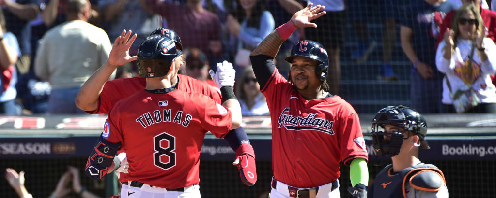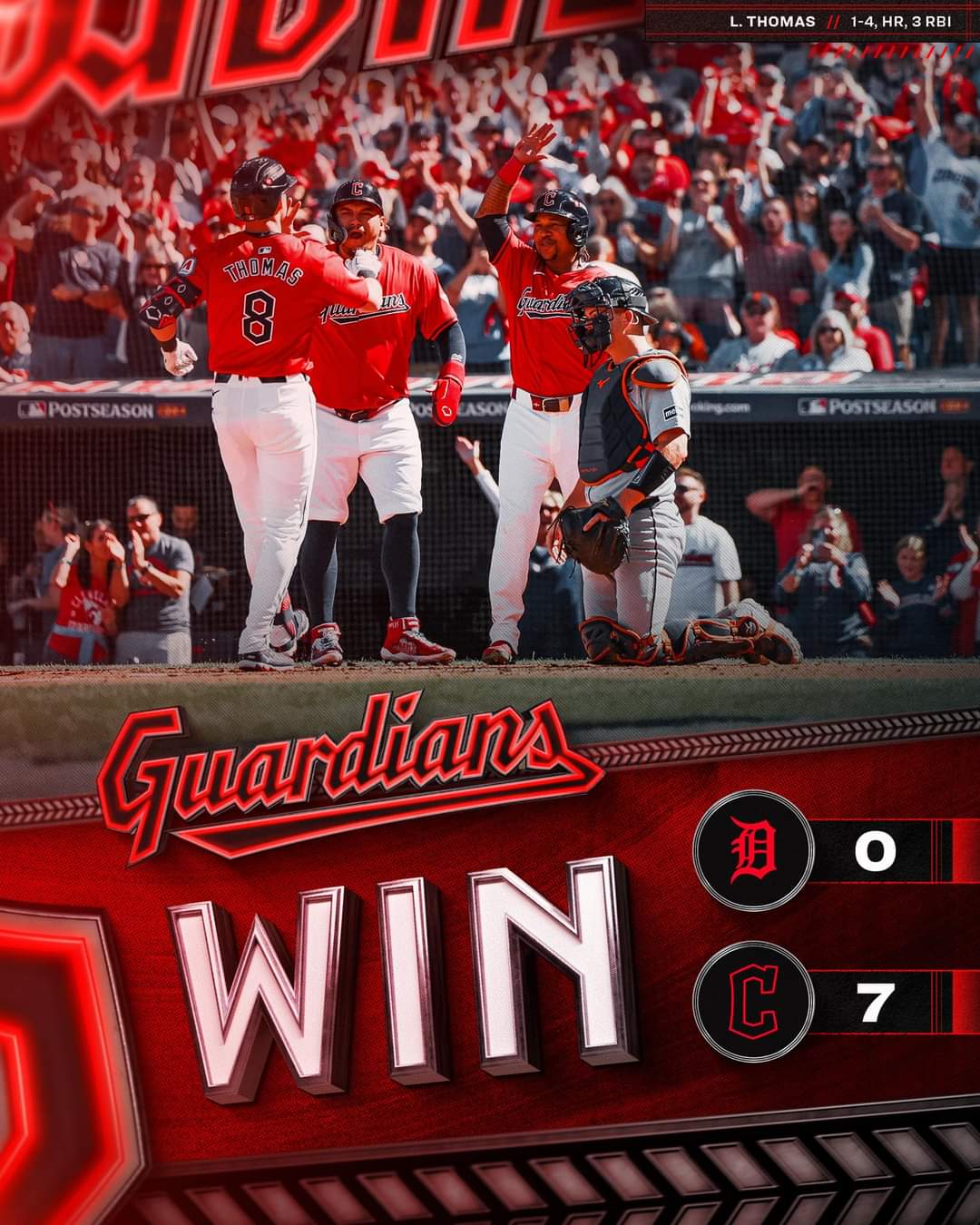 Fue entonces cuando Lane Thomas conectó un jonrón de tres carreras, convirtiendo a los Guardianes en el primer equipo de la Liga Americana en anotar cinco carreras antes de registrar un out en un juego de playoffs. El único otro conjunto en hacerlo fueron los D-backs el año pasado contra los Dodgers en una victoria por 11-2 en el Juego 1 de la Serie Divisional de la Liga Nacional, que terminaron barriendo en tres juegos.