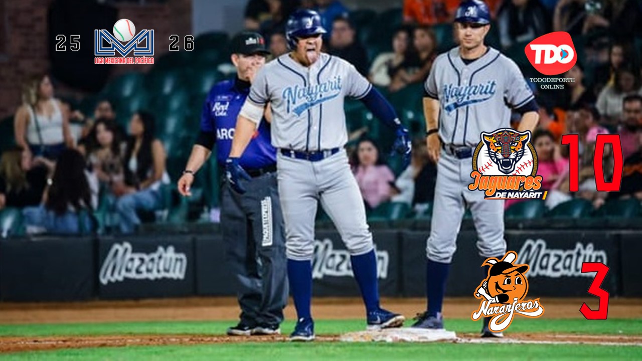 Hermosillo, Sonora.- Los Jaguares de Nayarit explotaron su poder ofensivo el martes por la noche en el estadio Fernando Valenzuela al conectar 18 incogibles, para derrotar 10 por 3 a los Naranjeros y de paso igualar la octava serie del rol regular de la campaña 2025-2026 de la Mexicana del Pacífico.