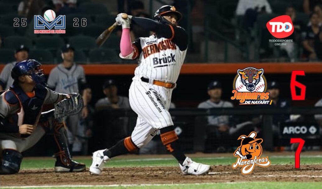 Hermosillo, Sonora.- Los Naranjeros continuaron con su buena racha y este martes se llevaron el triunfo sobre los Jaguares de Nayarit al son de 7 carreras a 6.