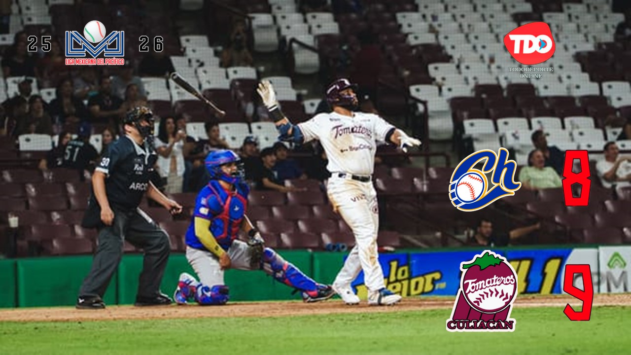 Culiacán, Sinaloa.- Los Tomateros de Culiacán remaron contra la corriente para dejar tirados en el terreno de juego a los Charros de Jalisco en la novena entrada tras ganar 9 por 8 en el primer encuentro de la octava serie de la temporada 2025-2026 de la Liga Mexicana del Pacífico.