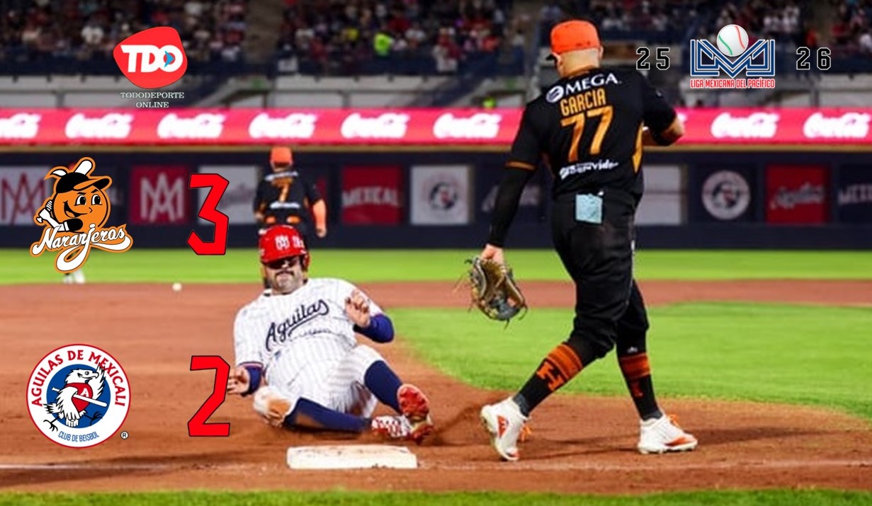 Mexicali, BC.- Un dramático encuentro se vivió este domingo en el Nido de los Águilas y viniendo de atrás los Naranjeros de Hermosillo remontaron un cerrado duelo para imponerse en extra innings 3-2 a los Águilas, para completar la barrida en El Nido dentro de la sexta serie de la temporada 2025-2026 de la Liga Mexicana del Pacífico.