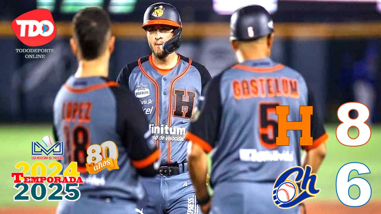 Zapopan, Jalisco.- Con un gran regreso en la recta final del encuentro, los campeones Naranjeros de Hermosillo se impusieron este martes 8-6 a los Charros de Jalisco en el inicio de la primera serie del rol regular de la Temporada 2024-2025 de la Liga Mexicana del Pacífico en el estadio Panamericano.