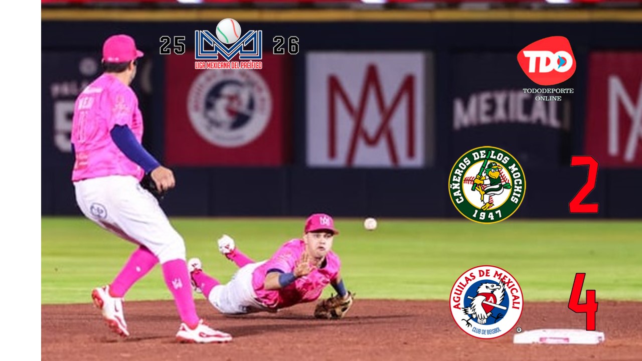 Mexicali, BC.- El cuarto bat Phillip Evans remolcó tres carreras, para comandar la victoria de los Águilas sobre Cañeros de Los Mochis por 4-2 en el primer juego de la novena serie del rol regular de la campaña 2025-2026 de la Liga Mexicana del Pacífico.