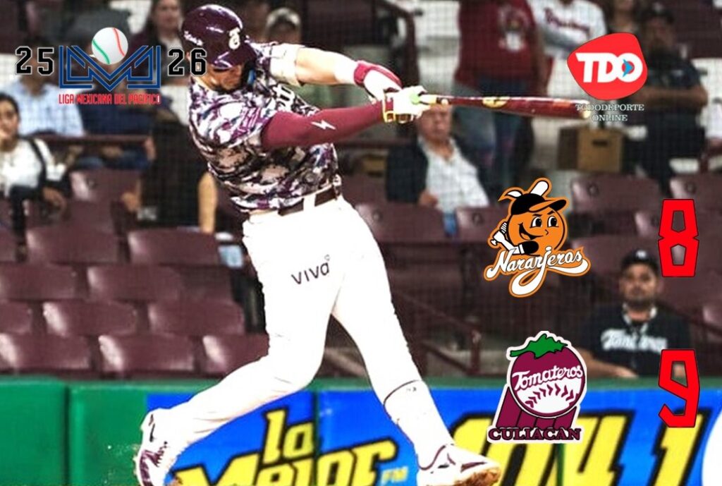 Culiacán, Sinaloa.- Los Tomateros lograron un dramático triunfo en 11 peleados episodios sobre los Naranjeros de Hermosillo al son de 9 carreras a 8 en el estadio General Ángel Flores dentro de la segunda vuelta de la temporada 2025-2026 de la Liga Mexicana del Pacífico.
