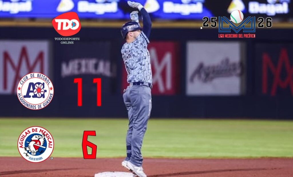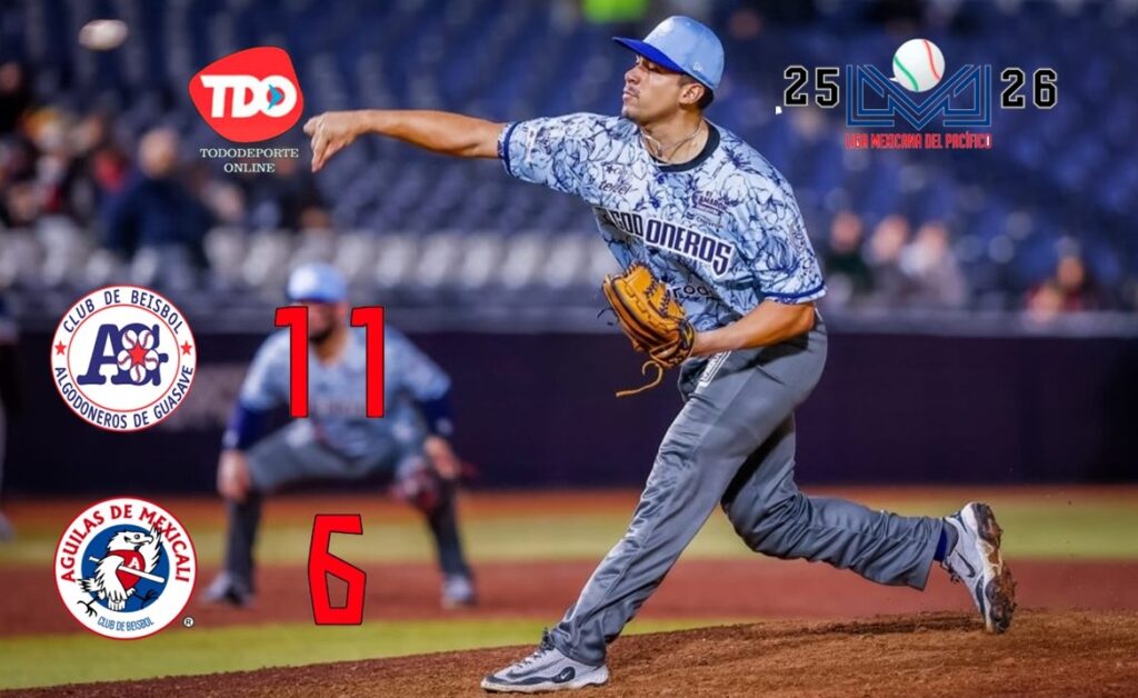Mexicali, BC.- Algodoneros de Guasave desató una ofensiva de 14 imparables para repetir paliza sobre Águilas de Mexicali, ahora por 11-6, para hilvanar su cuarto triunfo y de paso asegurar la serie en El Nido.