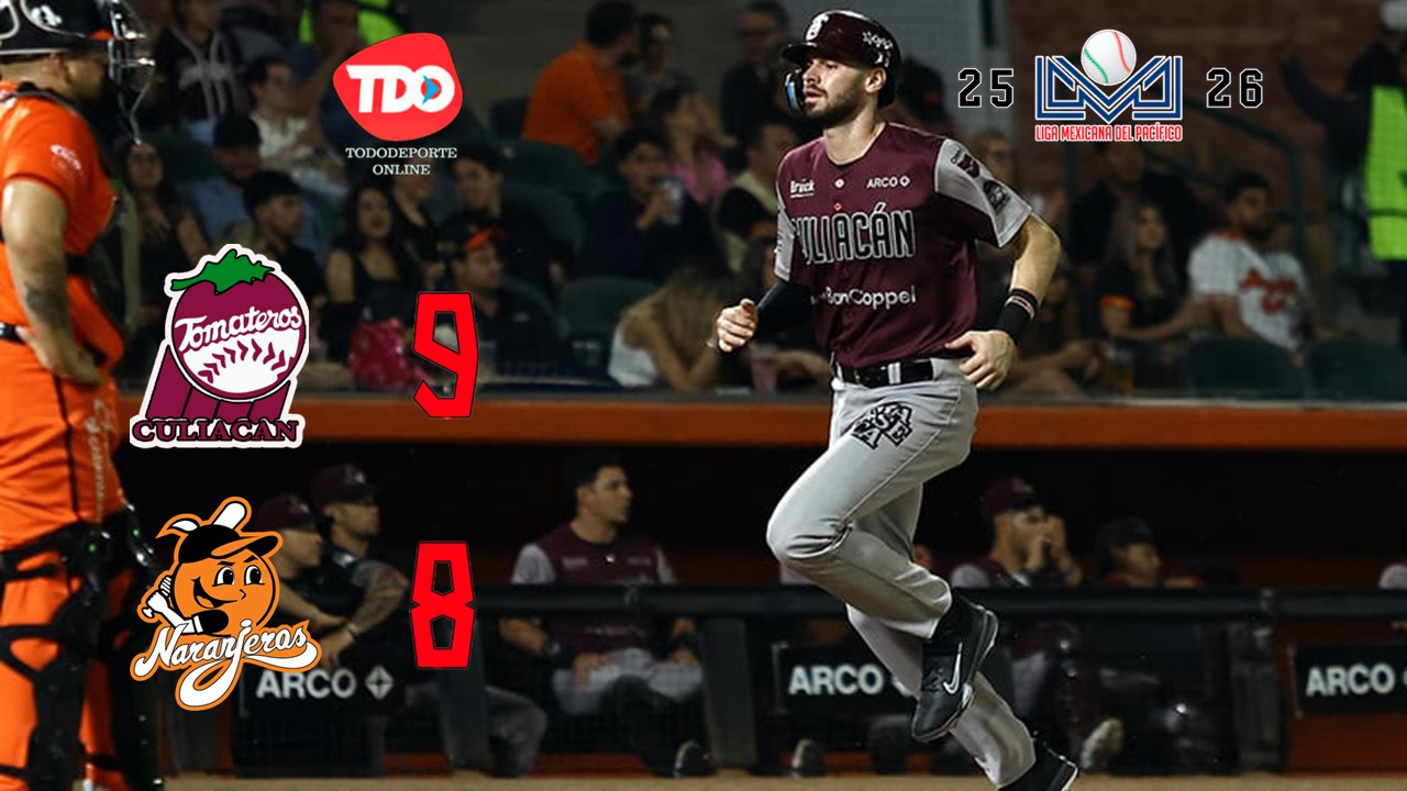 Hermosillo, Sonora.- Los Tomateros de Culiacán pintaron de guinda el Clásico de la Liga Mexicana del Pacífico tras vencer 9-8 a los Naranjeros en el estadio Fernando Valenzuela al concluir la cuarta serie del rol regular de la campaña 2025-2026.