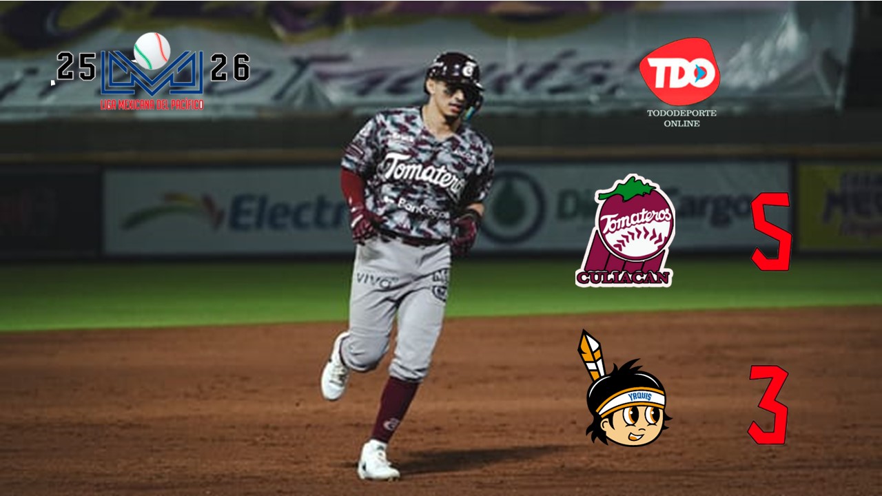Ciudad Obregón, Sonora.- Los Tomateros de Culiacán asumieron a la cima en la Liga Mexicana del Pacífico tras vencer derrotar 5-3 a domicilio a los Yaquis en el primero de la serie al continuar el rol regular de la campaña 2025-2026.