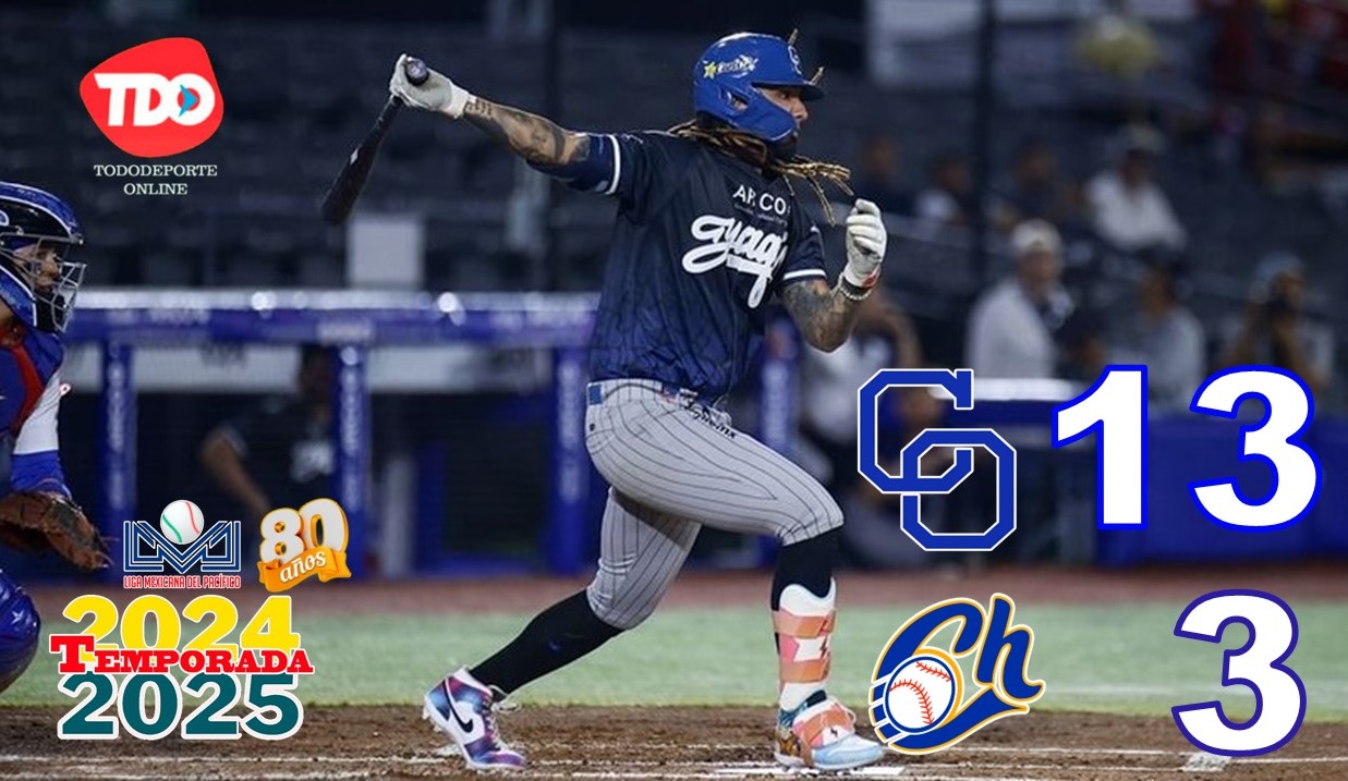 Guadalajara, Jalisco.- Los maderos tronaron con 16 imparables, el pitcheo se fajó y los Yaquis de Obregón vencieron a domicilio 13-3 a Charros de Jalisco para quedarse con el tercer juego y con ello la serie correspondiente a la primera. vuelta de la Temporada 2024-2025 presentada por Caliente.mx de la Liga ARCO Mexicana del Pacífico (LAMP).