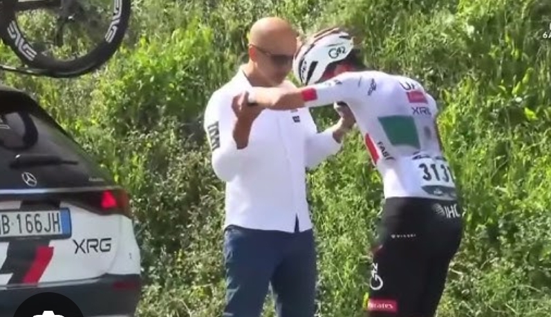 Finalmente se observa a Del Toro volver a subir a su bicicleta, donde se muestra el fuerte raspón en la pierna derecha y el glúteo con el maillot roto. Metros más adelante, el auto del equipo lo detiene y Joxean Fernández ‘Matxín’, director deportivo, intercambia palabras con él para decidir el abandono.
