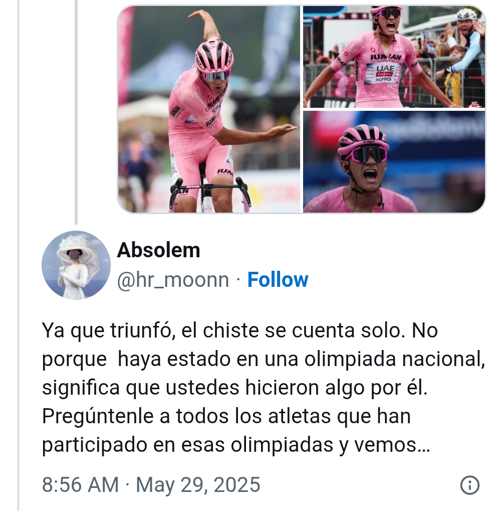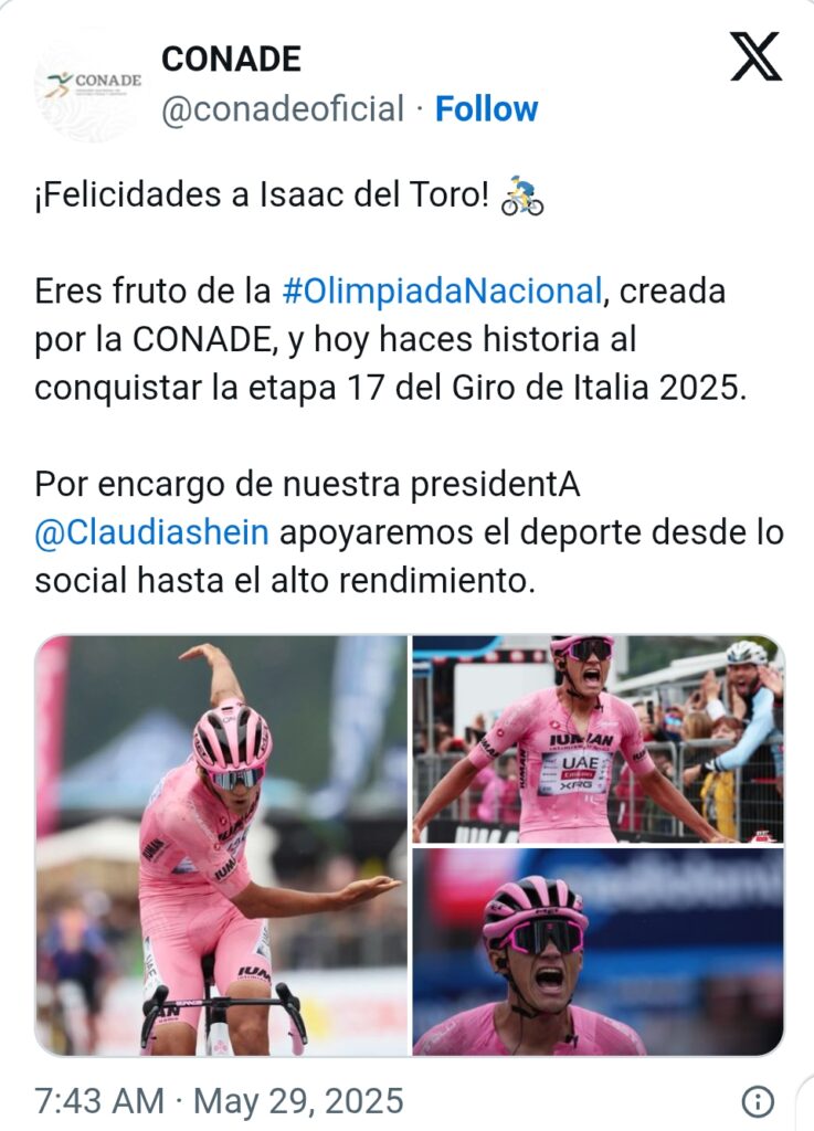 “¡Felicidades a Isaac del Toro! Eres fruto de la #OlimpiadaNacional, creada por la CONADE, y hoy haces historia al conquistar la etapa 17 del Giro de Italia 2025”, escribió la Conade en la red social X, un día después del triunfo del mexicano.