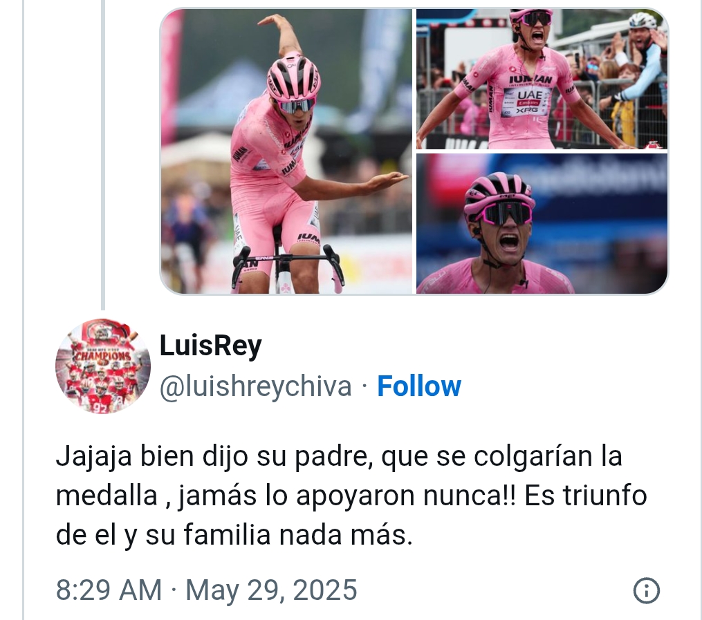 “¡Felicidades a Isaac del Toro! Eres fruto de la #OlimpiadaNacional, creada por la CONADE, y hoy haces historia al conquistar la etapa 17 del Giro de Italia 2025”, escribió la Conade en la red social X, un día después del triunfo del mexicano.