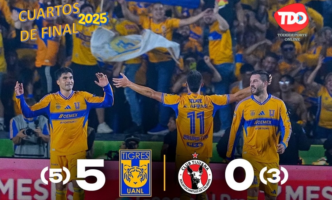 San Nicolás de los Garza, NL.- Los Tigres dieron un zarpazo a los Xolos de Tijuana que jamás olvidarán en su historia tras ganar por goleada de 5-0 el juego de vuelta de los cuartos de final del Apertura 2025, después de haber caído 3-0 en la ida en la frontera.