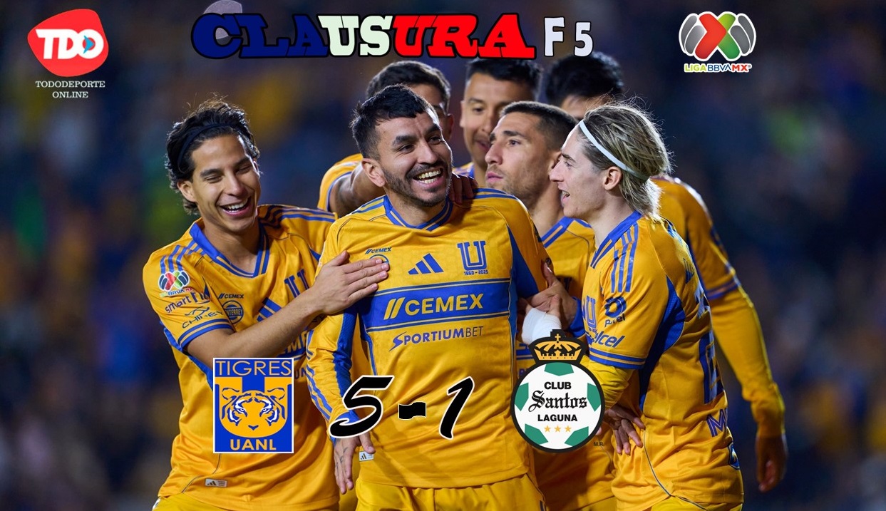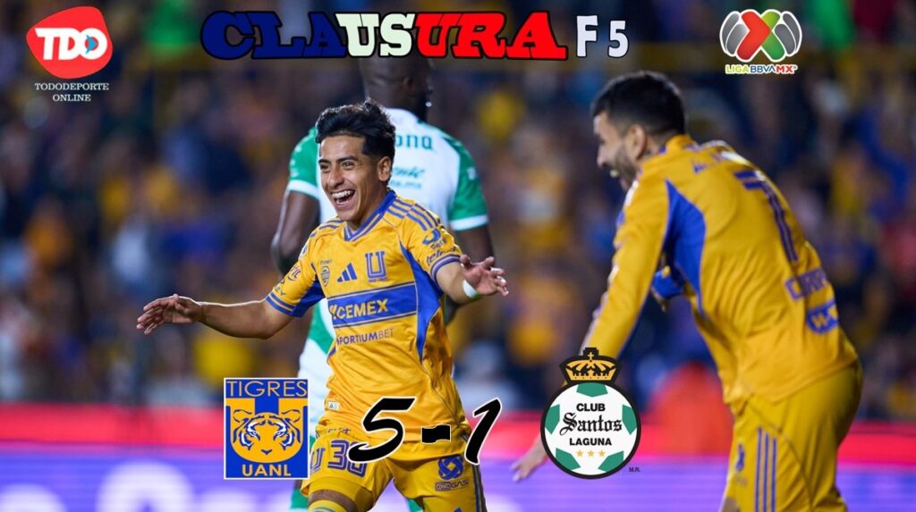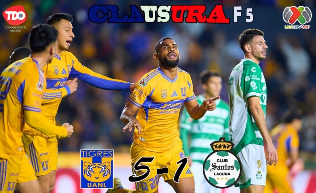 San Nicolás, NL.- Tigres de la UANL se repuso de un gol en contra para arrollar 5 por 1 al Santos al inicio de la quinta jornada 5 del Torneo Clausura 2026 de la Liga MX.